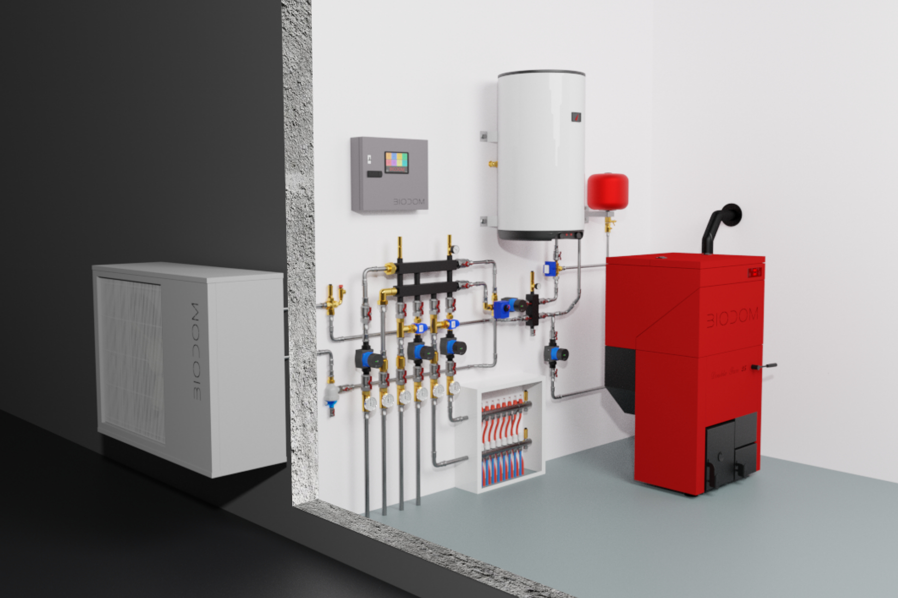 Automātika ļauj izvēlēties optimālāko hibrīda režīmu, pārslēdzot starp katlu, siltumsūkni un saules kolektoru atkarībā no laika apstākļiem. Siltumsūknis BIODOM var būt jebkuras jaudas: 6, 9, 12 un 16 kW.